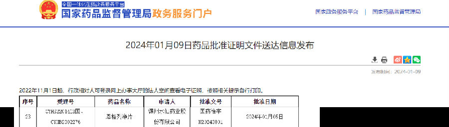 水仙藥業(yè)作為上市許可持有人首個化藥產(chǎn)品恩格列凈片(10mg),于2024年1月5日獲得國家藥品監(jiān)督管理局頒發(fā)藥品注冊批件,并視同通過一致性評價 (批準(zhǔn)文號:國藥準(zhǔn)字H20243001)。