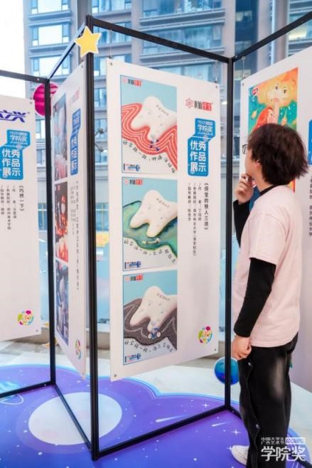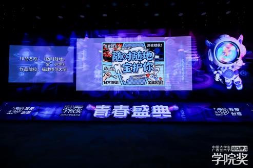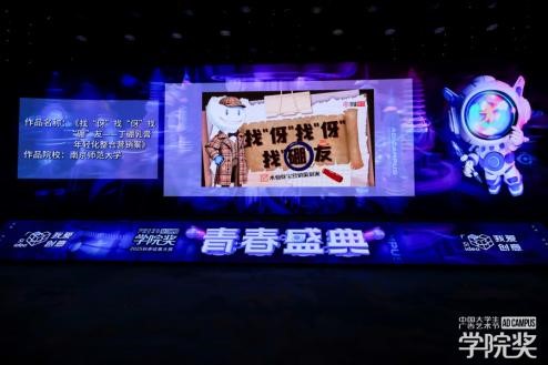 頒獎典禮現(xiàn)場特設(shè)創(chuàng)意作品展區(qū),一幅幅鮮活吸睛的平面設(shè)計、一段段趣味十足的短視頻,憑借潮流化的視覺語言與場景化的表達形式,吸引眾多師生駐足觀賞、拍照打卡。